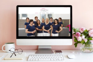 Technology, communication and remote job concept. Front view of nice workplace of female copywriter with fresh flowers, mug and generic desktop computer with blank display for your advertising content vor 4 Jahren in