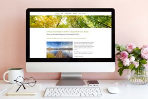 Technology, communication and remote job concept. Front view of nice workplace of female copywriter with fresh flowers, mug and generic desktop computer with blank display for your advertising content vor 4 Jahren in