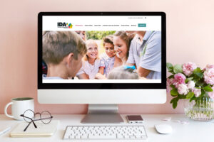 Technology, communication and remote job concept. Front view of nice workplace of female copywriter with fresh flowers, mug and generic desktop computer with blank display for your advertising content vor 4 Jahren in